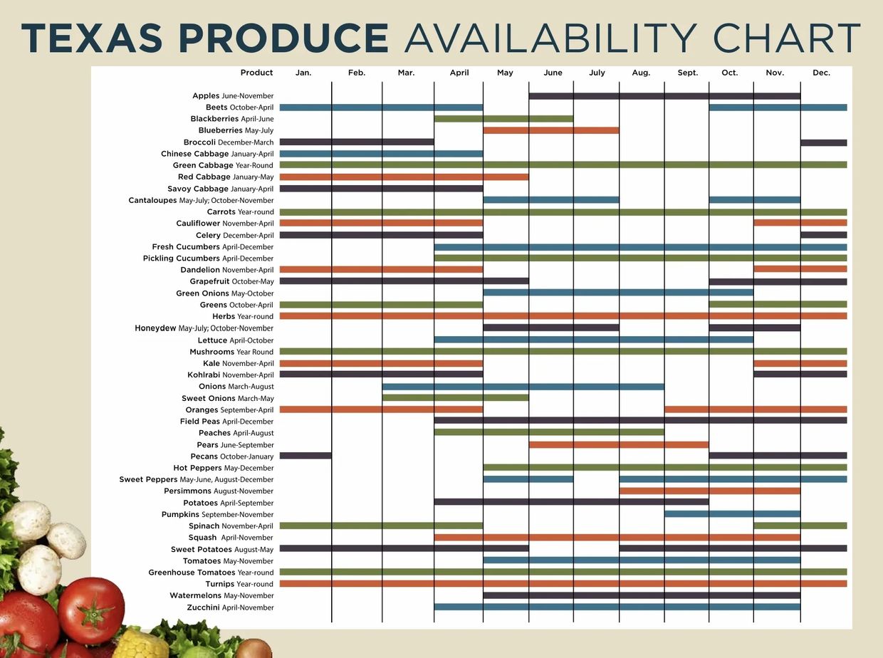 Texas ranks among the top producers of fresh fruits and vegetables, offering an abundance of delicious choices year-round. Keep in mind, harvest dates can vary based on weather, crop variety, and growing region. This chart provides an average timeline to help you plan your garden or market visits. Support your local growers by shopping at farmers markets, joining CSA shares, or picking your own produce. Together, we can help build stronger, healthier communities.